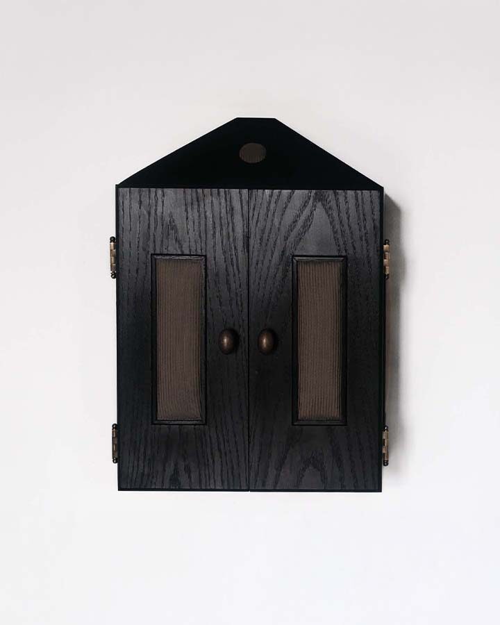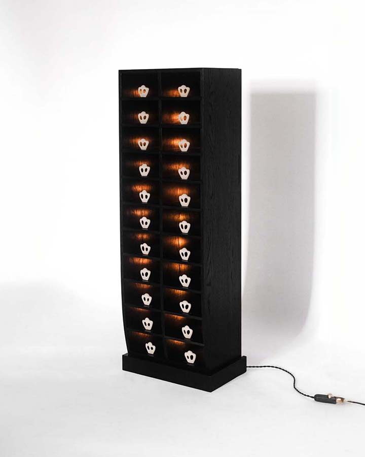 Hand drawn ceramic tiles invoke wonder in this iteration of a series of wall-mounted cabinets.