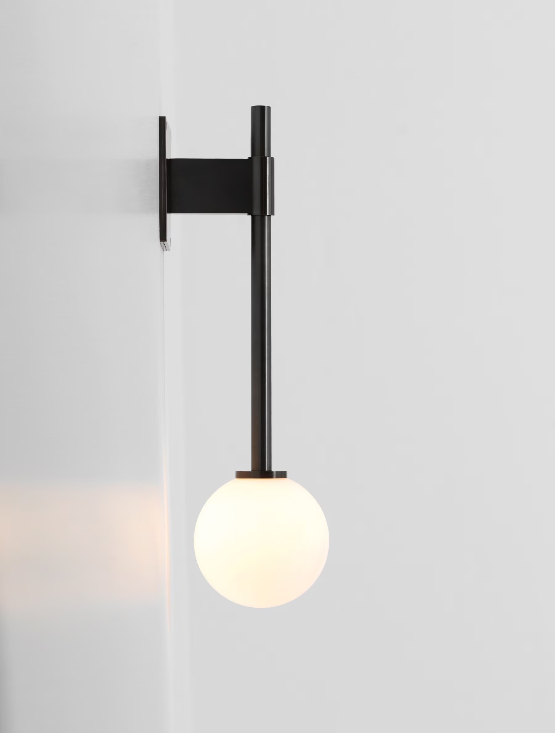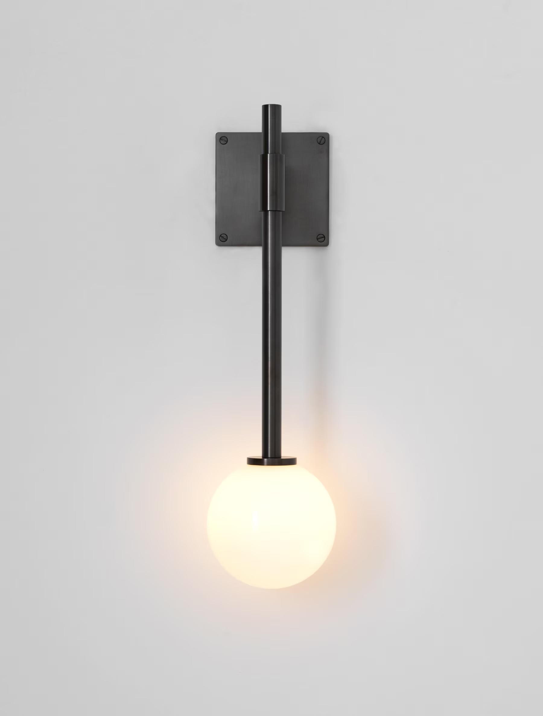 The Bastion collection employs classic glass orbs in playful proportions to offer an even source of light. The singular orb of the Bastion Wall Lamp is suspended by a brass rod and attached to a bracket style metal arm and rectangular brass mounting plate. Shown in Verdigris, a special finish option. Inquire