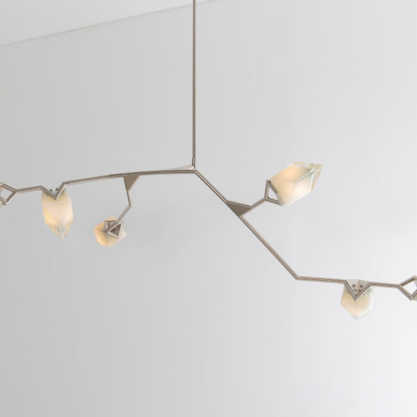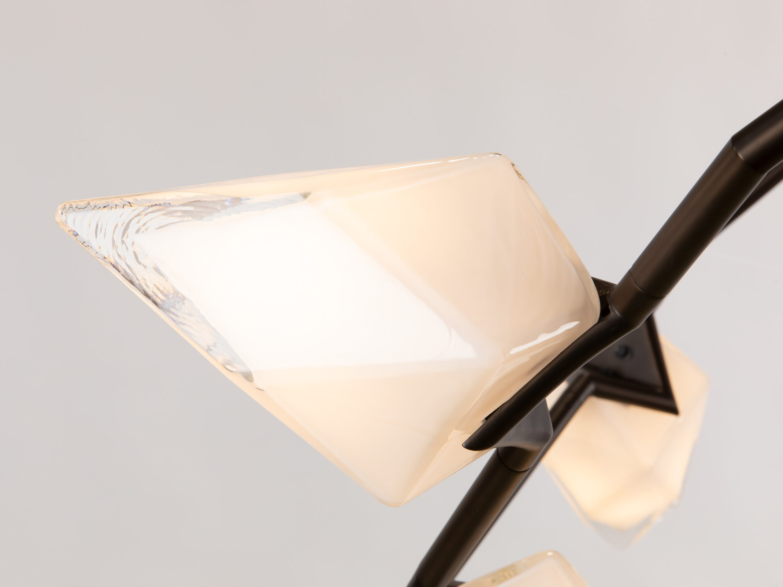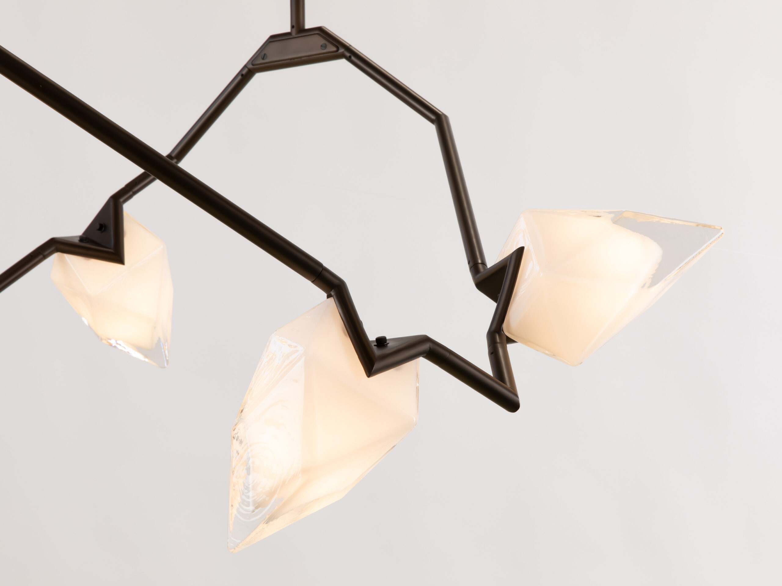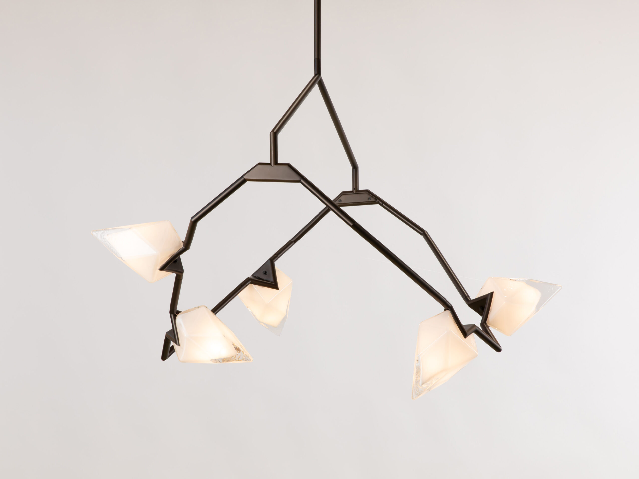 Seed 5.1 branches from a central stem into five faceted shades that cast a warm, diffused glow. Its angular geometries make for a captivating centerpiece — a sculptural accent that brings the elegance of nature’s forms into interior spaces. Shown in Oil Rubbed Bronze, White Glass.