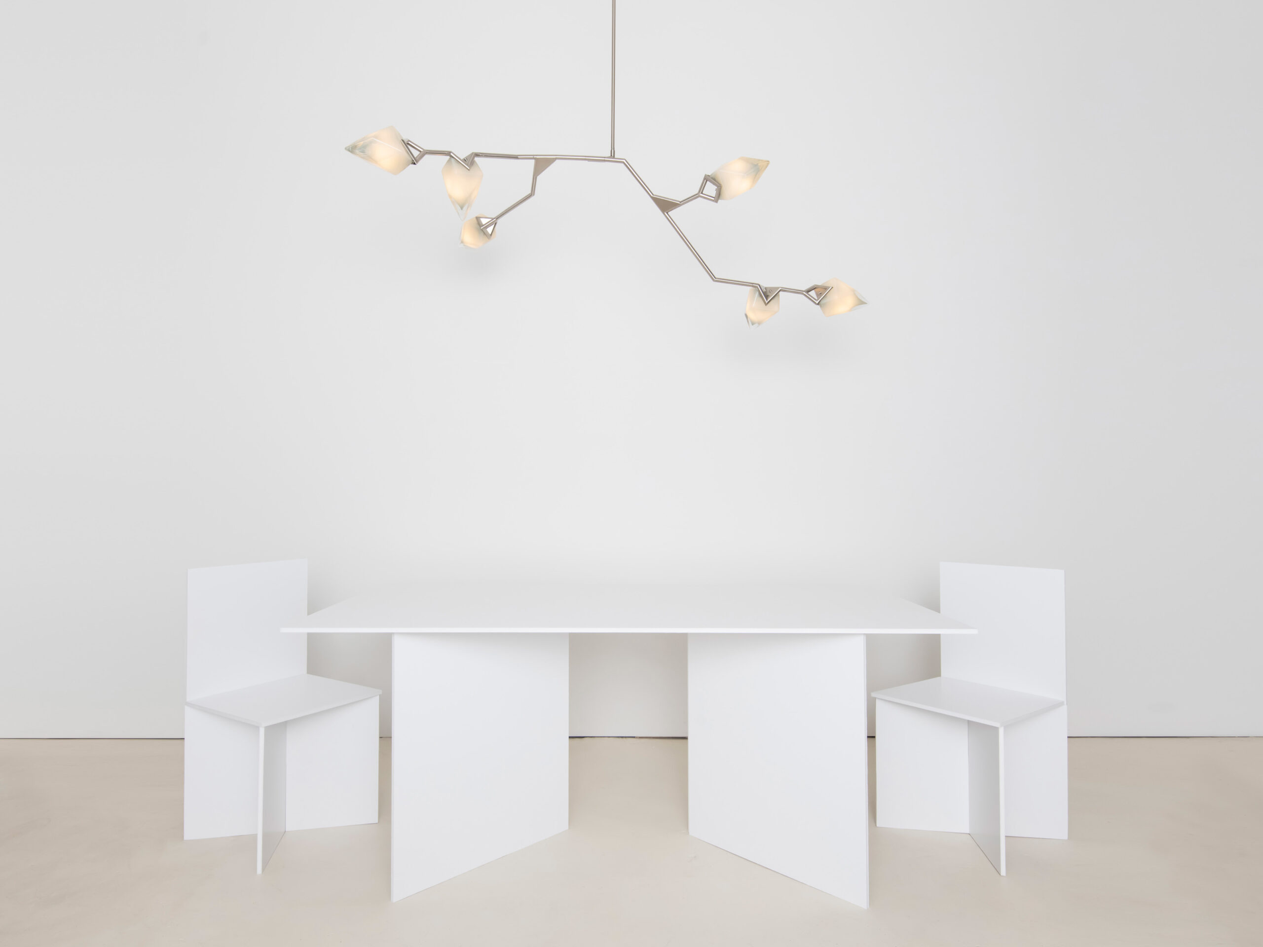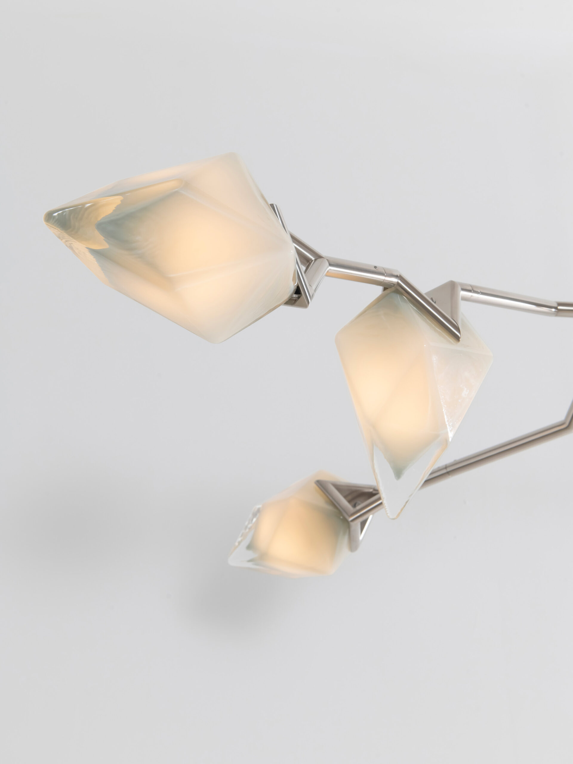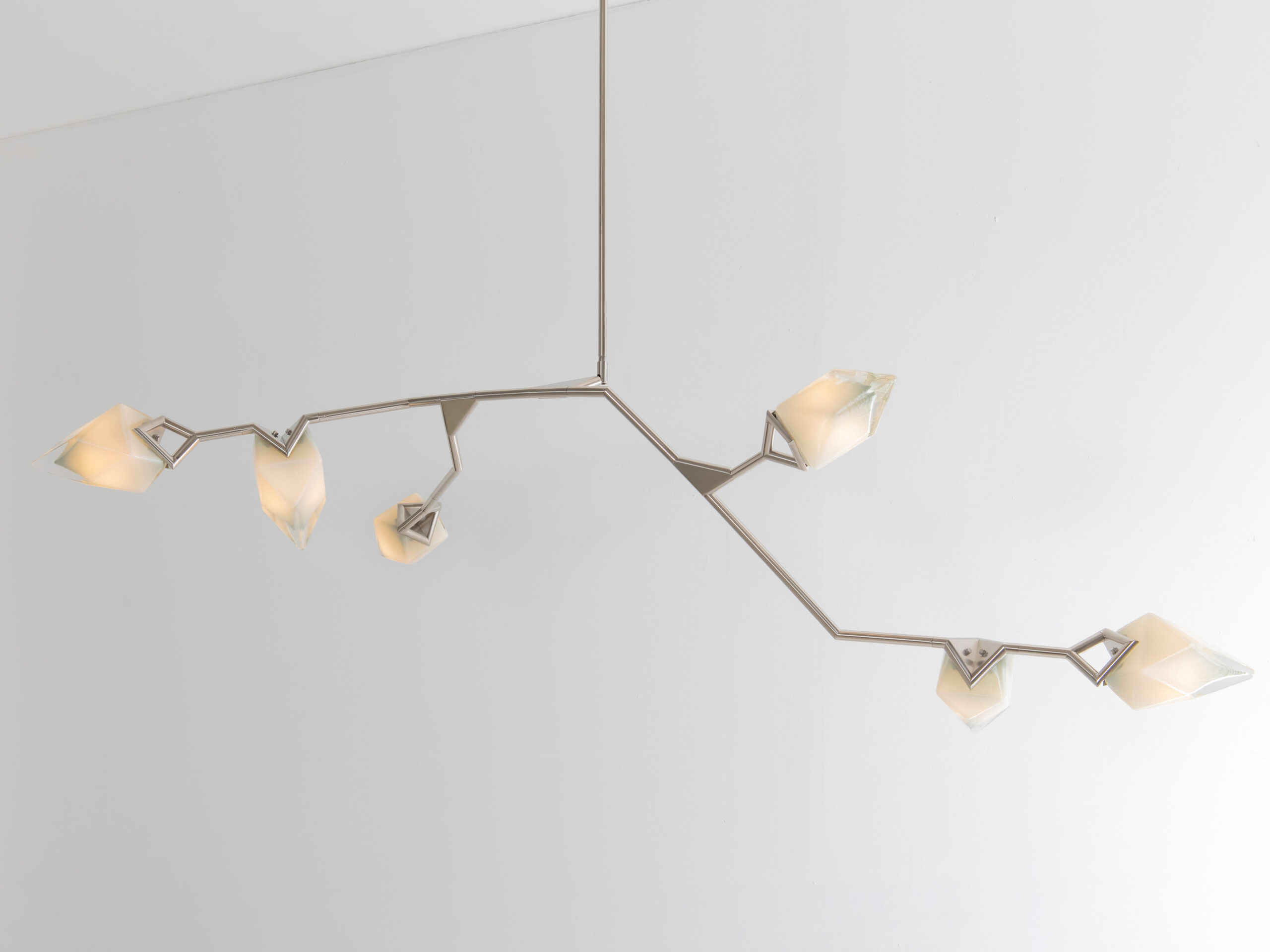 Seed 6.1 branches from a central stem into six faceted shades that cast a warm, diffused glow. Its angular geometries make for a captivating centerpiece — a sculptural accent that brings the elegance of nature’s forms into interior spaces. Shown in Satin Nickel, Grey Glass.