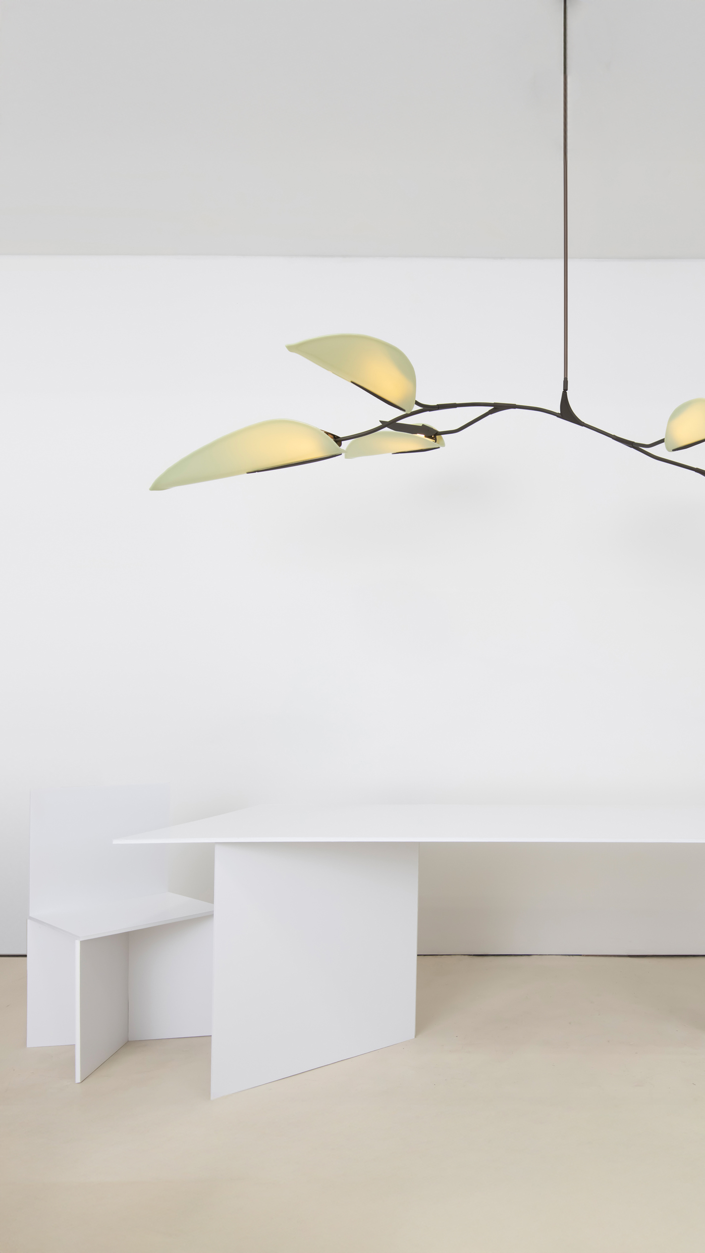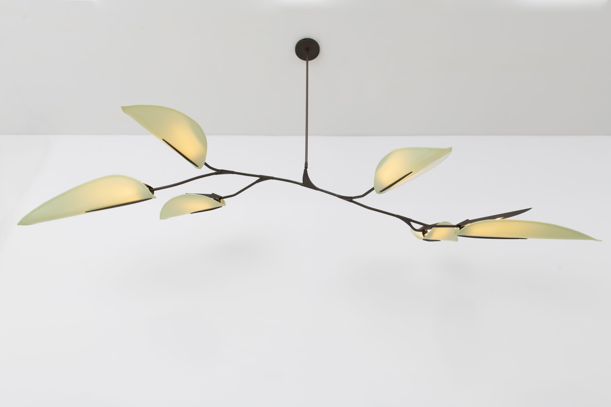 The Unfurl collection is a testament to the delicate beauty of botanical forms. Unfurl 6 Leaf extends from a central stem into six of the collection’s signature leaf-shaped reflectors, casting a warm, soft glow — a sculptural centerpiece for interiors that blend minimalism with organic elegance. Each leaf is able to spin on its axis, allowing for adjustment of light direction. Shown in Medium Antique Bras, Celadon Glass.