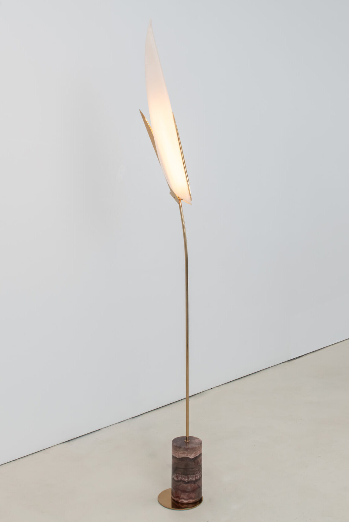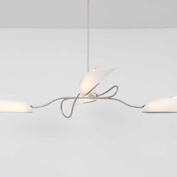 The Unfurl collection is a testament to the delicate beauty of botanical forms. Atop the slender brass stem of Unfurl Floor Tall sits an elegant glass diffuser that nests a soft, warm glow — its thoughtful precision and material integrity create a sculptural accent for interiors that reflect the elegance of nature. Each leaf is able to spin on its axis, allowing for adjustment of light direction. Shown in Satin Nickel, White Wispy Glass, and Black Marble.