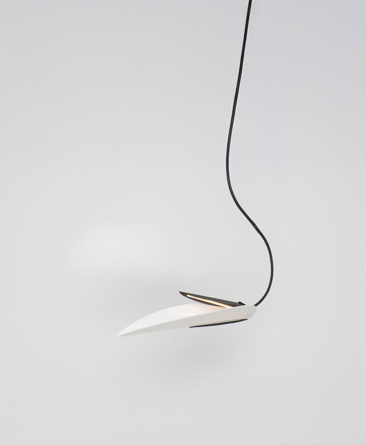 The Unfurl collection is a testament to the delicate beauty of botanical forms. Unfurl Pendant 1 (S Curve) highlights the collection’s leaf-shaped reflectors, its suspended form celebrating the intricacy of organic structures — a refined sculptural accent for interiors that blend minimalism with natural elegance.Each leaf is able to spin on its axis, allowing for adjustment of light direction. Shown in Oil Rubber Bronze, White Glass.