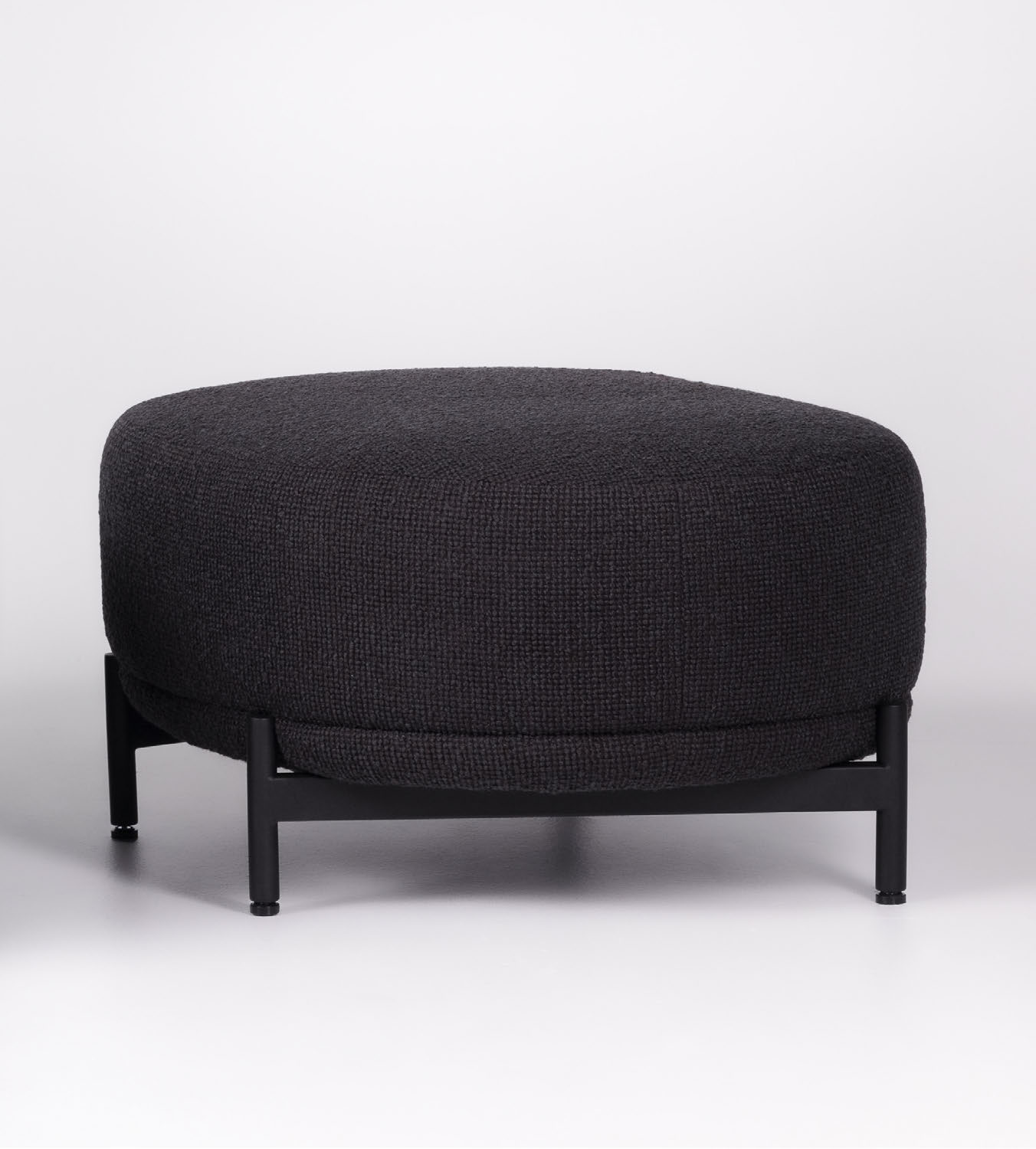 The AME Lamy Ottoman is upholstered in black wool atop a matte black metal frame which mimics the soft curves of its companion, the AME Lamy Lounge. Shown in custom woven fringe textile with matte black metal. Custom materials, dimensions and finishes available.